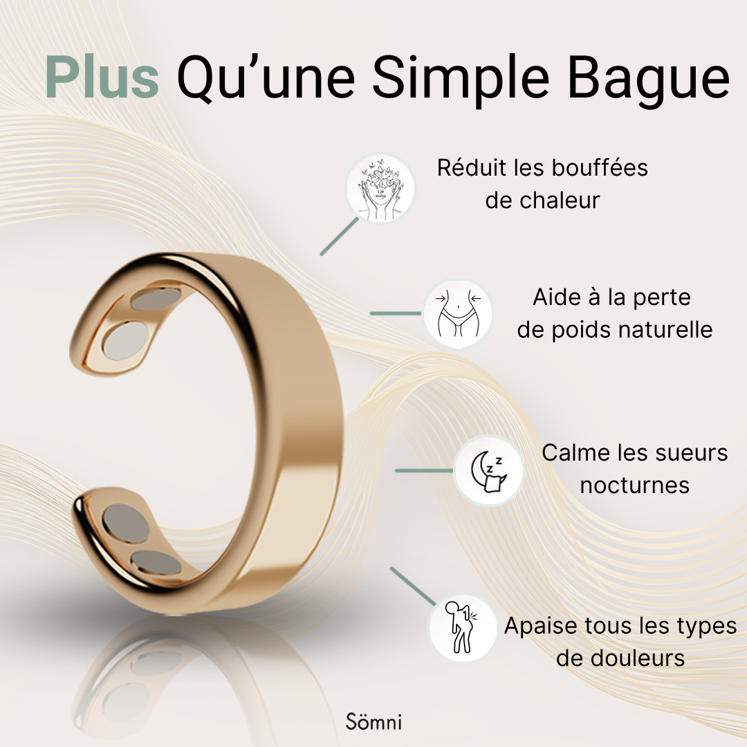 Laura Juillet 2025Enfin libérée de mes bouffées de chaleur !Je transpirais jour et nuit, j’étais à bout. Les bouffées de chaleur me gâchaient la vie.Depuis que je porte la bague Sömni, elles sont devenues bien plus rares et supportables.Je me sens aussi beaucoup plus calme, mon stress a énormément diminué.Franchement, je n’aurais jamais cru qu’un simple bijou puisse me faire autant de bien.Bague Sömni