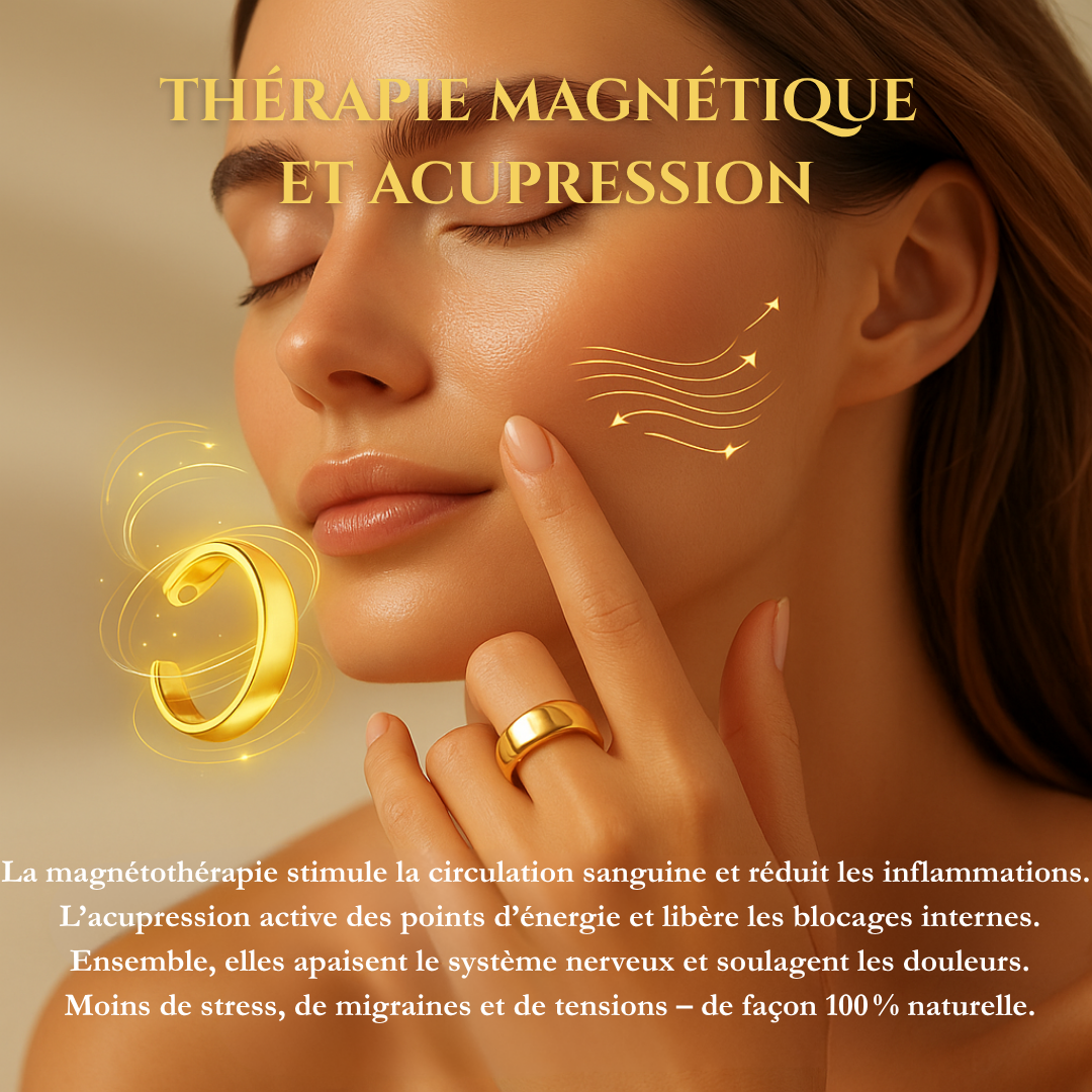 Grâce à une combinaison unique d’acupression apaisante et de magnétothérapie, la bague aide le corps à se détendre naturellement et à libérer les tensions – souvent à l’origine des douleurs.